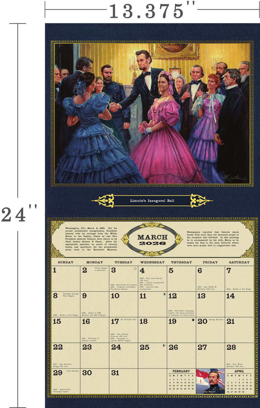 Our calendars are elegantly designed showcasing the full-color artwork by the renowned artist, Mort Künstler. Our 2026 Civil War and Commanders in Gray calendars superbly captures the important moments of the Civil War - from fond farewells to riveting battle scenes.