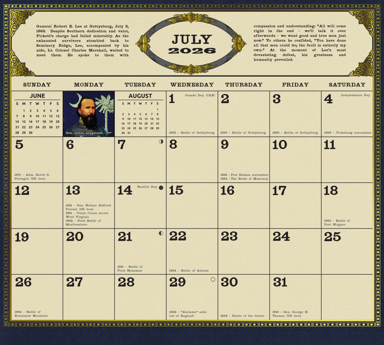 Our calendars are notated throughout the year with significant historical dates and events from the Civil War. Detailed captions accompany each month's painting that are sure to delight every history lover!